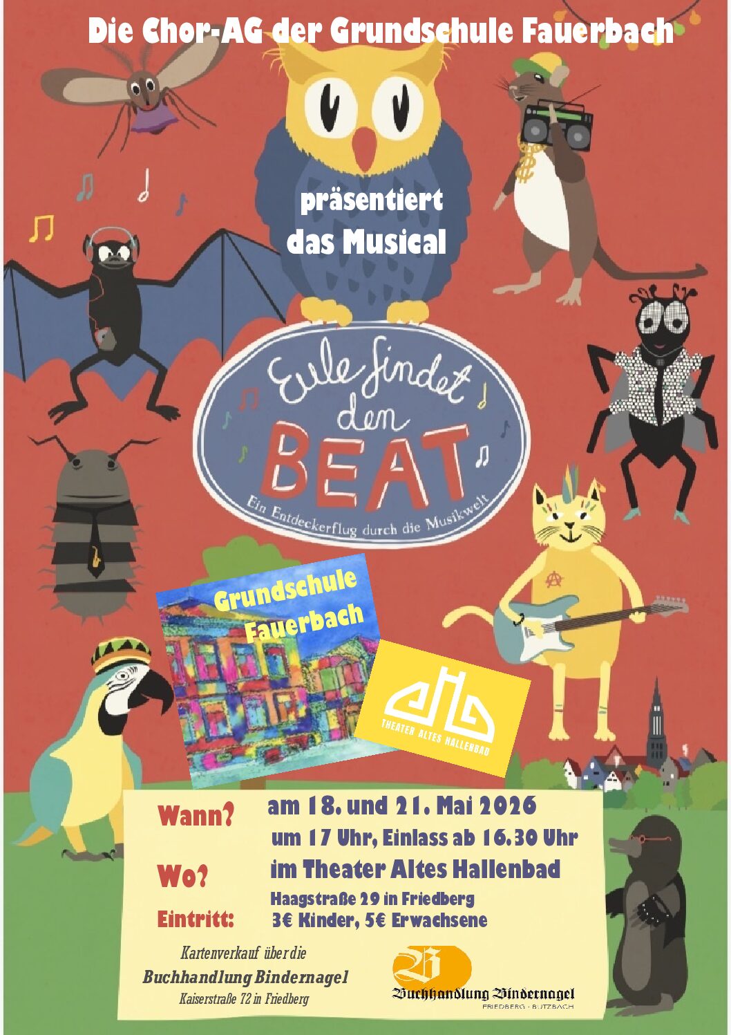 Die Grundschule Fauerbach, als musikalische Grundschule bekannt, führt mit ihrer Chor‑AG das Musical „Eule findet den Beat“ auf. Die Aufführungen finden am 18. Mai und 21. Mai 2026 jeweils um 17 Uhr (Einlass ab 16:30 Uhr) im Theater altes Hallenbad statt. Karten gibt es im Vorverkauf bei der Buchhandlung Bindernagel; Erwachsene zahlen 5 Euro, Kinder 3 Euro. Ziel ist es, die persönliche, kreative und musikalische Entwicklung der Schülerinnen und Schüler zu fördern sowie kulturelle Angebot der Region zu bereichern.